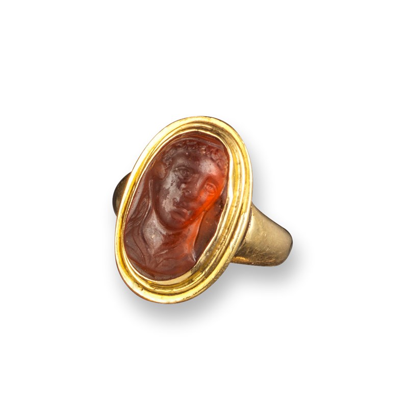 A Hellenistic garnet cameo depicting the head of Omphale, c1st century BC, in an early 19th century gold ring, the cameo 1.6cm high, ring size H