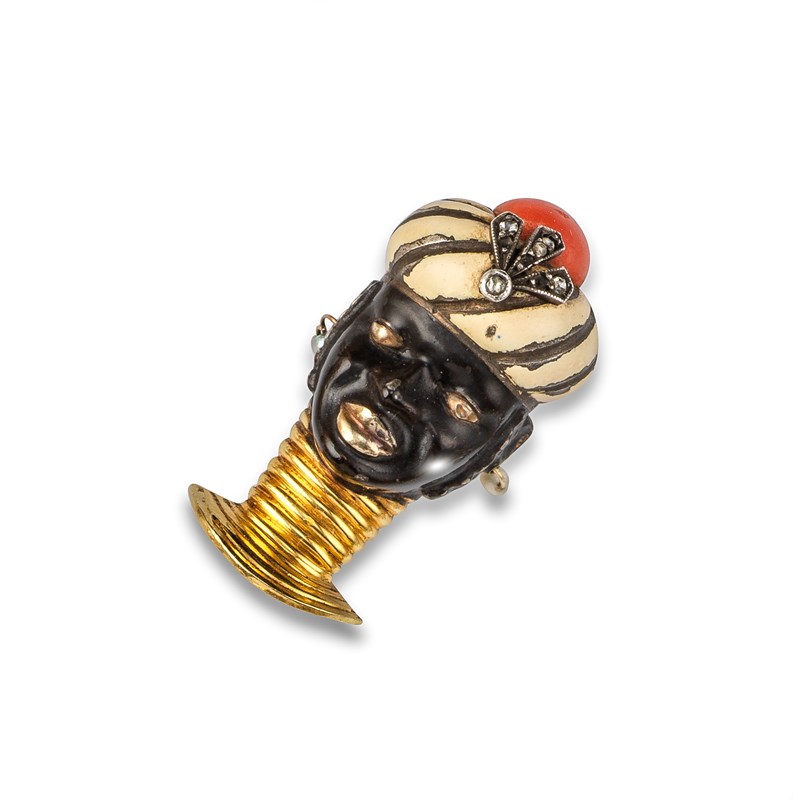 ‡ An enamel and diamond blackamoor brooch by Cartier, wearing a cream enamel turban with seed pearl earrings, enhanced by coral and rose-cut diamond detail, signed Cartier, Paris, with French control mark, numbered 5570, 3.4cm high