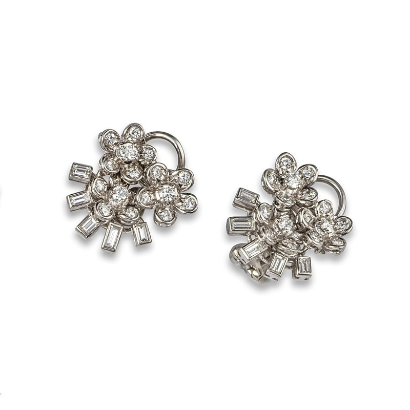 A pair of diamond flowerhead cluster earrings, set with circular-cut diamond foliate clusters and sprays of baguette-shaped diamonds in platinum and white gold, with detachable clip earring and brooch clip fittings, so that the earrings can be worn as double clips, 2cm widest
