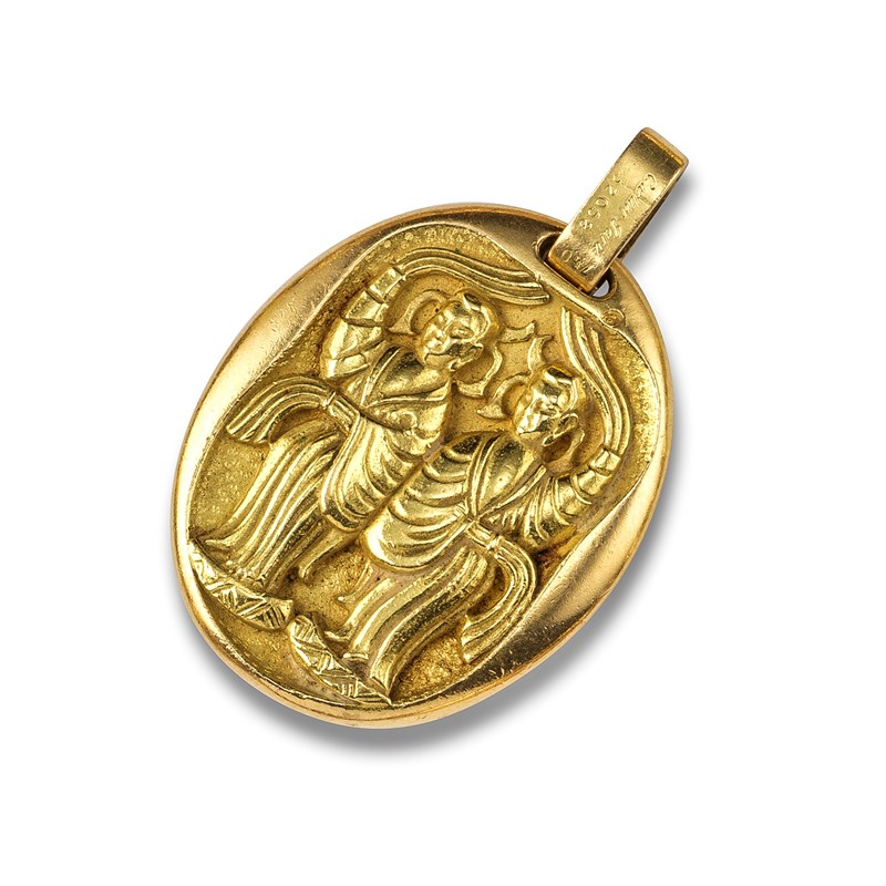 A gold zodiac pendant by Cartier, depicting the Gemini twins with zodiac sign to reverse, French control marks, signed Cartier Paris to bale and inventory number 32058, obscured maker's lozenge (possibly GD), 4.3cm high