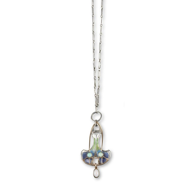 An Jugendstil silver and gold pendant marked for Murrle Bennett & Co and Theodor Fahrner, decorated with blue and green enamel and an opal set pierced gold surmount, suspending a further oval opal cabochon. The pendant 5cm long. On fine link silver neck chain, 40cm long, Marked 950, TF and MB&Co to reverse.