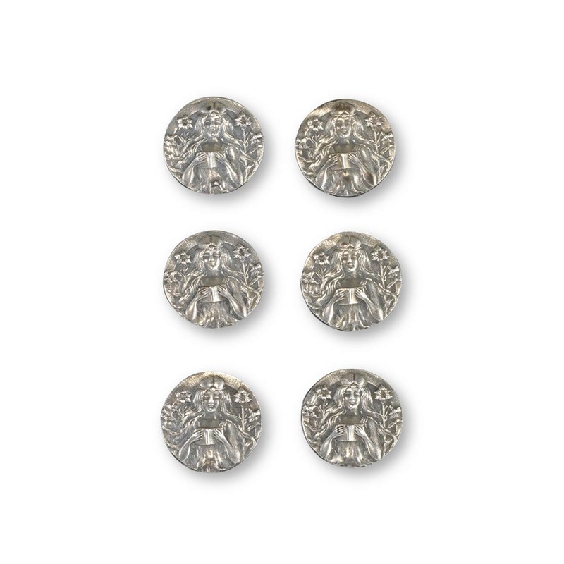 A set of six Art Nouveau circular silver buttons. Each chased with a girl reading a book with lillies. Birmingham marks for 1901. Maker AW. 1.9cm wide.