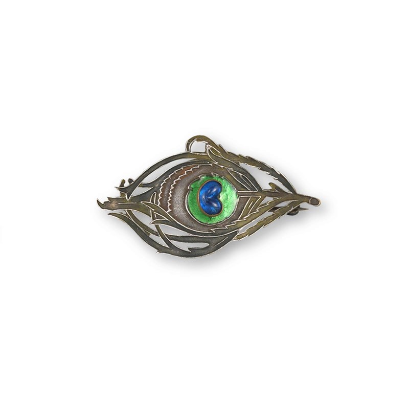 An Arts and Crafts peacock feather brooch, centred with a blue paste on green enamel ground. 4.5cm.