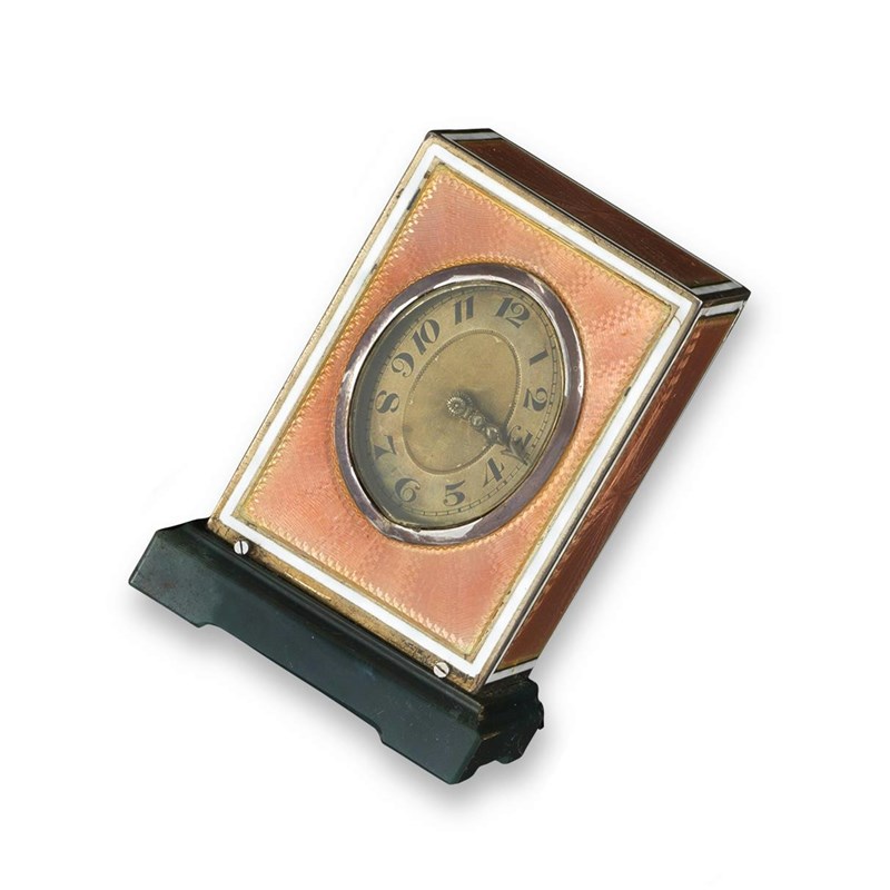 A small rectangular form silver mantle clock. The oval dial with black Arabic numerals, the hands set with small diamonds. The face, sides and top decorated with pink guilloche enamel within plain white borders. On a carved green stone plinth. Numbered to the reverse 10254, Geneva clock company. Maker GS and London import marks for 1924. Apertures for winding, hands and slow/fast adjustment. 7cm high. With fitted travel box containing a key and the dilapidated silk linking marked for Asprey, 166 Bond Street, London.