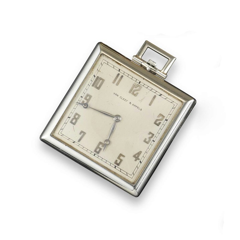 A French Art Deco open faced dress wristwatch by Van Cleef & Arpels, The signed dial applied with platinum Arabic numerals, the movement signed Vacheron & Constantin. Numbered 39672. The case marked 10376. The case stamped with French control marks. 4cm wide.