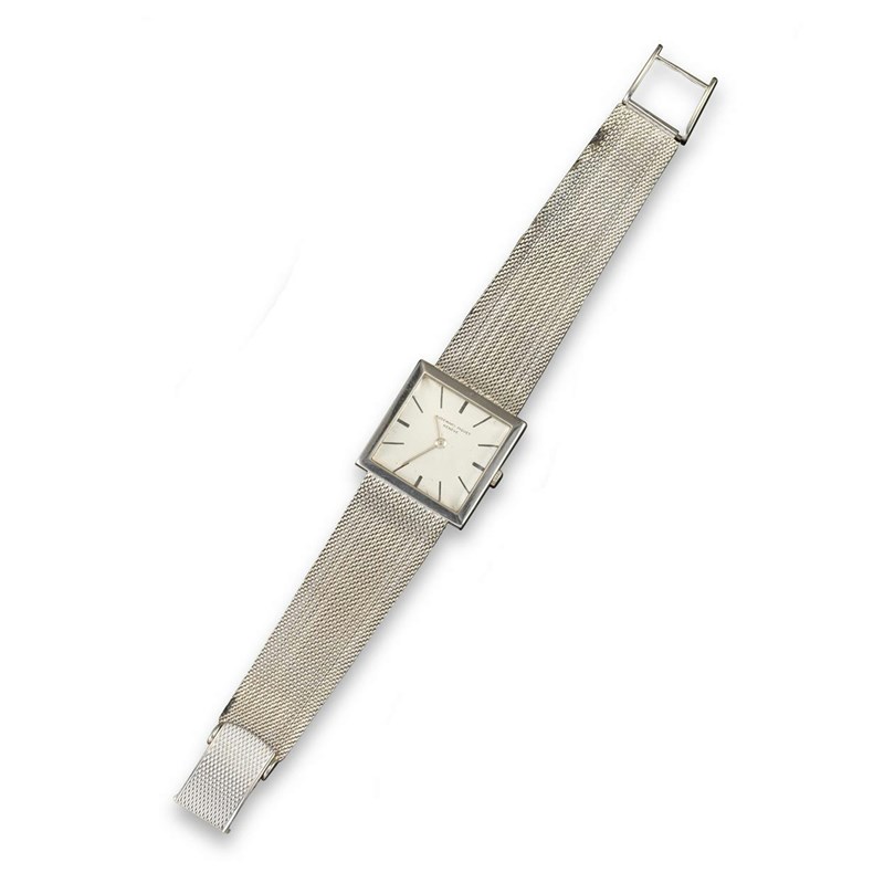 An 18ct white gold dress wristwatch, the square dial (1.9cm) signed Audemars Piguet. Case numbered 18760 on an 18ct integrated white gold band. Damaged.