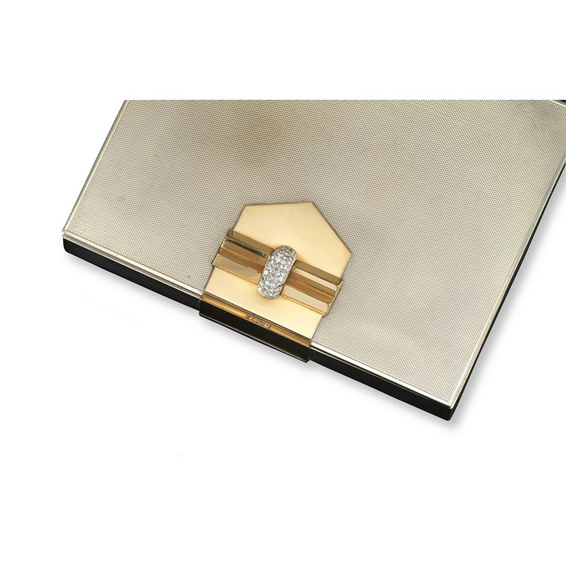 A styptor, gold and diamond minaudière, by Van Cleef & Arpels, of rectangular form, the styptor minaudière with a clasp designed as a bullet-shaped rose gold plaque and a pavé-set diamond panel, opening to reveal a fitted mirror, a cigarette numbered 48041, a compact numbered 48040, a lipstick holder, and two additional compartments, 15 x 12cm. Signed La Minaudiere De Van Cleef & Arpels and stamped 2456. In a black silk fitted Van Cleef and Arpels pouch. With a gold quizzing glass.