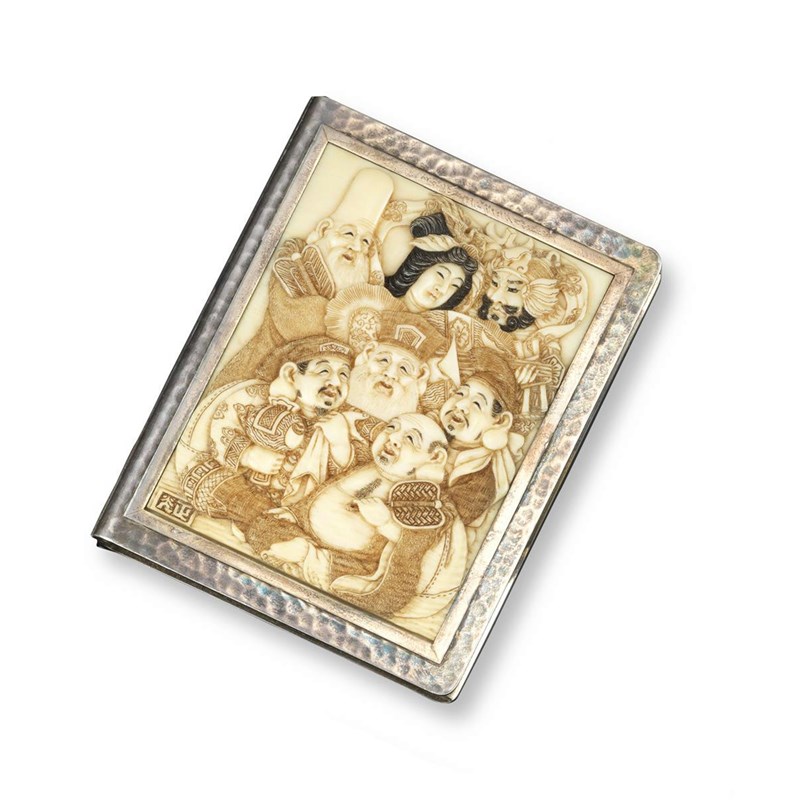 A Japanese beaten silver book form compact, the hinged cover mounted with a rectangular carved ivory plaque depicting various characters and signed. The reverse engraved with initials DRH. 8.5cm high. Fitted case for Okubo Bros, Imperial Hotel Arcade, Tokyo.