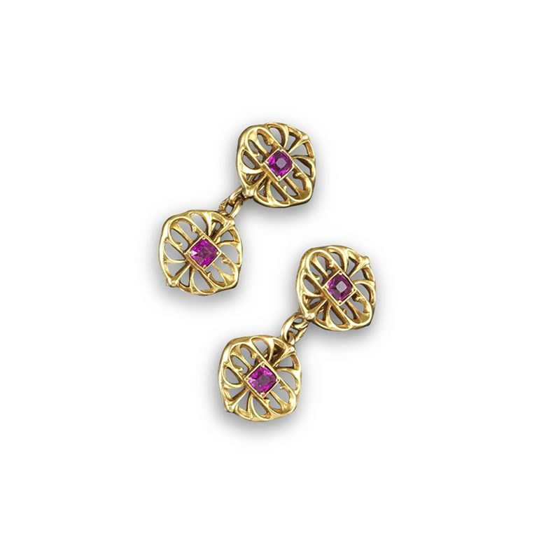 A pair of French gold ruby set cufflinks, the pierced links are each set with a cushion shaped ruby and with French control marks.