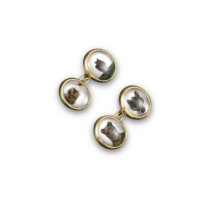 A pair of reverse carved crystal cufflinks, the oval discs depicting dogs and a wild boar in yellow gold mounts.