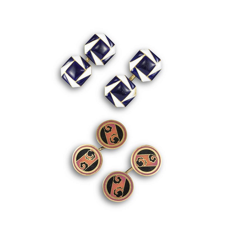 A pair of blue and white enamel cufflinks, of geometric design in octagonal silver gilt mounts. With a pair of circular silver gilt cufflinks applied with pink and black enamel design.