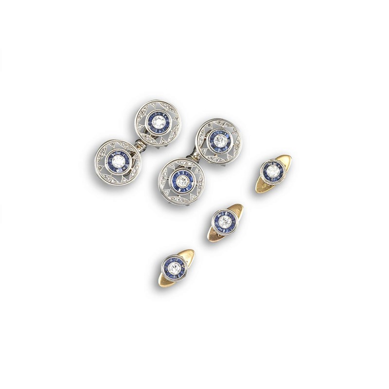 A pair of French diamond and sapphire set circular dress cuff links, each link centred with a circular cut diamond within calibre cut sapphire surround and further diamonds to the border in platinum and gold. French control marks. With three conforming diamond and sapphire set gold dress studs. Each stud marked with H R and maker's mark L C.