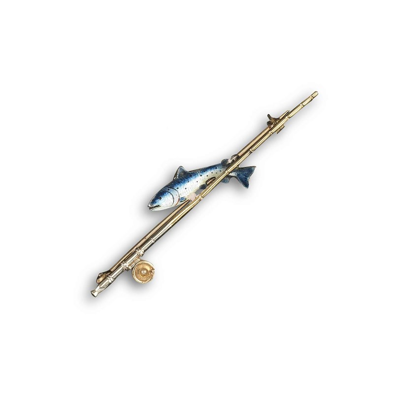 A gold fishing rod and silver salmon brooch, the fish with enamel decoration. 6.7cm long. Fitted case.