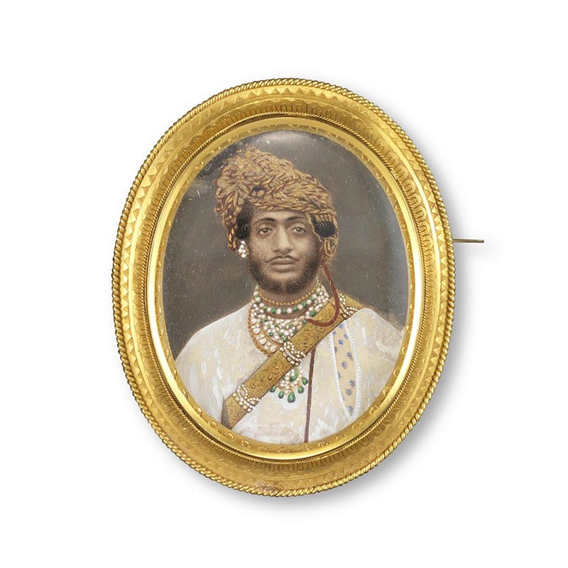 A 19th century oval brooch depicting an Indian gentleman within ropetwist and textured border....