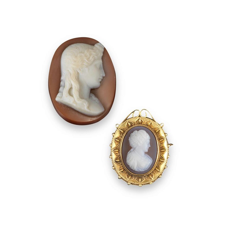 A carved hardstone cameo depicting the profile of a woman with flowing hair and a carved hardstone cameo mounted gold brooch.