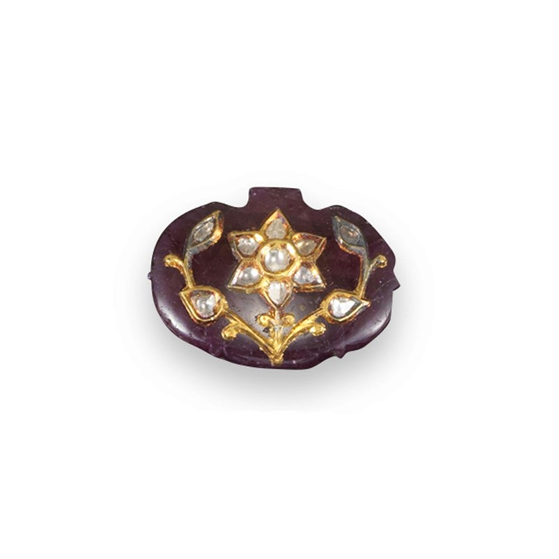 A carved ruby bead, applied with a diamond set gold flower head and carved flower to the reverse. 2.5cm wide.