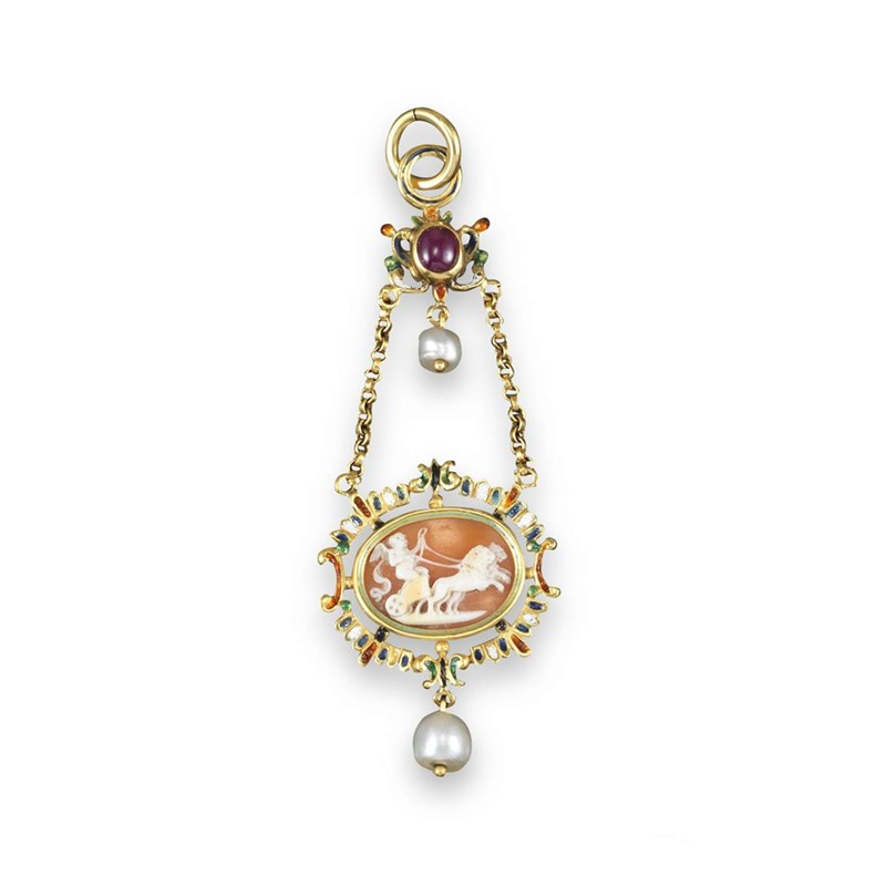 A gold pendant in the Renaissance style, mounted with a cameo depicting a putti in a chariot drawn by two lions in polychrome enamel frame, with cabochon ruby with two pearls. Enamel decoration continued to the reverse. 7cm.