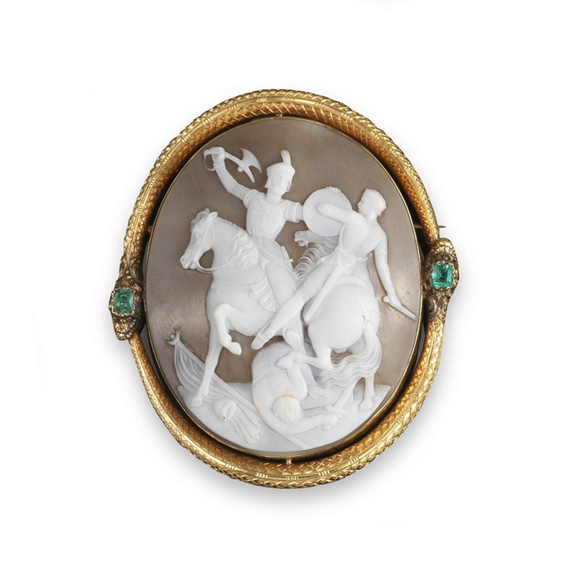 A 19th century cameo brooch, the well detailed carved shell cameo depicts two crusade inspired warriors on horses. The gold snake frame mounted with an emerald to each head. The cameo 5.5cm high.