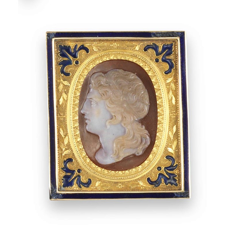 An early 19th century carved agate portrait cameo depicting the profile of Alexander the Great, his flowing hair tied with a band. Signed Cerbara (probably Giuseppe) in French gold frame with foliate and scroll border and blue enamel decoration. The cameo 2.4cm high.