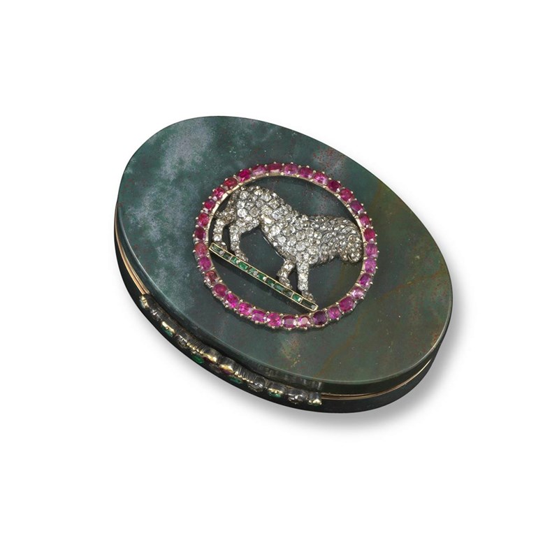 A George III bloodstone snuffbox, the hinged cover applied with a diamond set lion standing on a line of emeralds and within a circular border of rubies. The thumbpiece mounted with a line alternately set with emeralds, diamonds and surmounted with two further rubies. Gold mounts. 7cm wide.