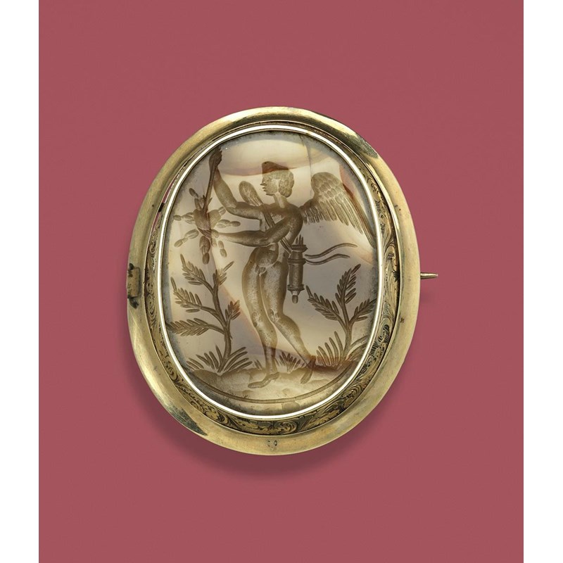 A 19th century gold brooch mounted with a banded agate oval intaglio depicting Eros plunging an arrow into a bleeding heart. second half of 17th century. 4.4cm high.