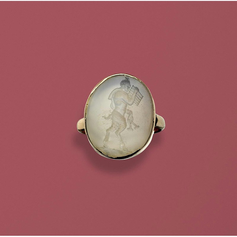 A gold ring mounted with an oval chalcedony intaglio, late 18th/early 19th century. Carved with a standing satyr, probably Pan. 1.9cm high.
