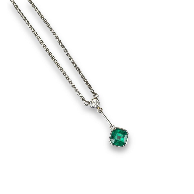 An emerald and diamond pendant, the octagonal cut emerald is mounted in white gold and suspends from a circular cut diamond on a fine link white gold neck chain.