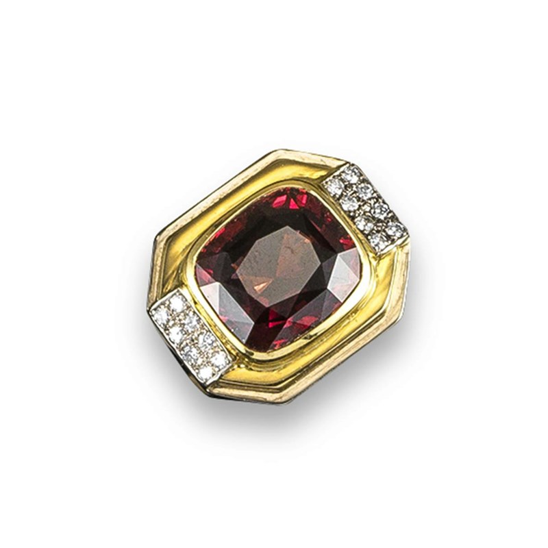 A garnet and diamond dress ring, the large cushion shaped garnet is set within an octagonal gold mount, flanked either side by two rows of circular cut diamonds in platinum and yellow gold. French control marks. Size K.