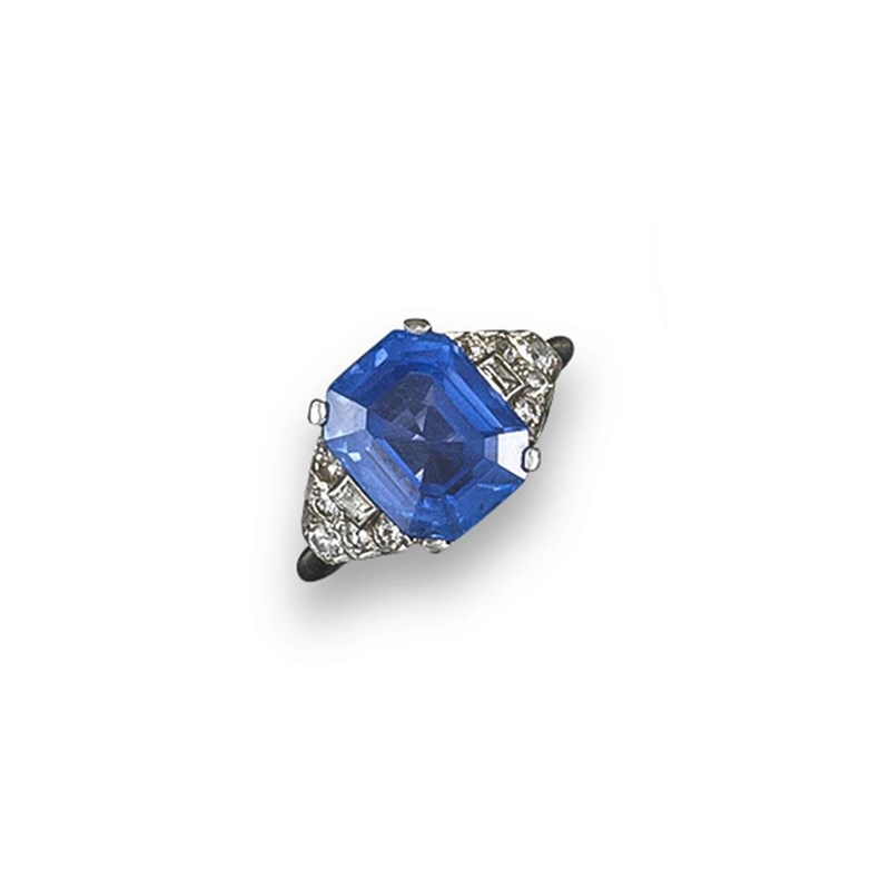An Art Deco sapphire and diamond ring, the octagonal cut sapphire weighs 5.71cts and is set with six small diamonds to each triangular shoulder in platinum. Size M.