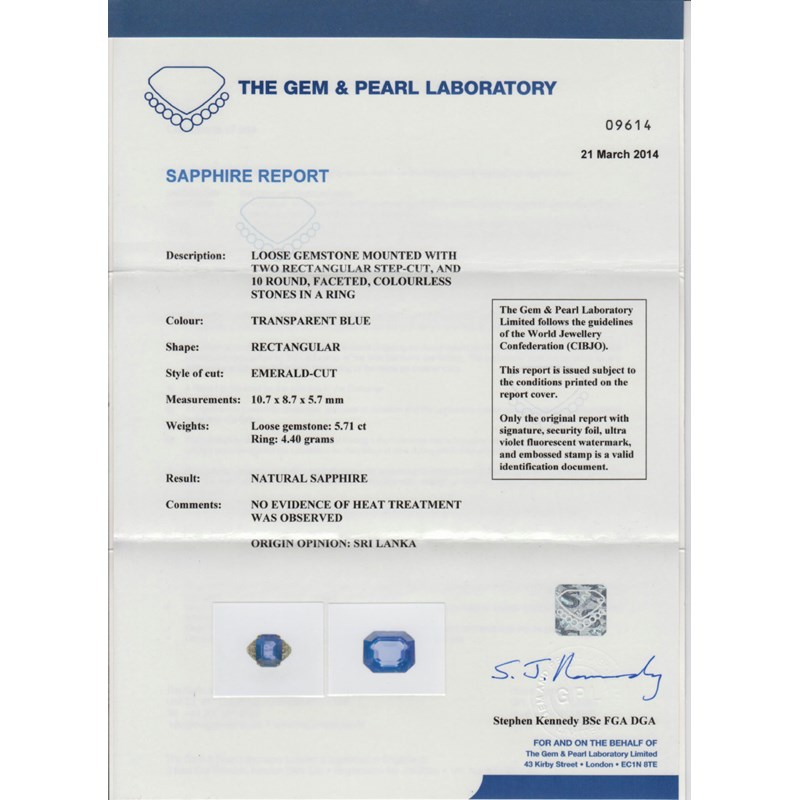 Accompanied by report number 09614 dated 21st March 2014 from The Gem and Pearl Laboratory, London stating that the emerald cut sapphire measures 10.7 x 8.7 x 5.7mm, weighs 5.71ct. With no evidence of treatment observed. Origin opinion: Sri Lanka.