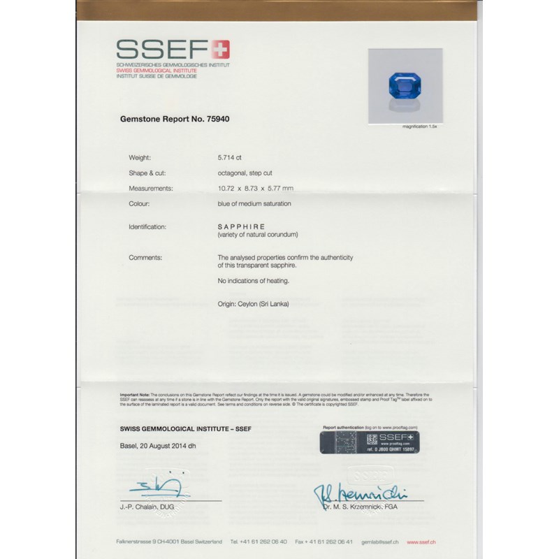 Accompanied by report number 75940 dated 20th August 2014 from SSEF stating that the step cut sapphire measures 10.72 x 8.73 x 5.77mm, weighs 5.714ct, with blue of medium saturation. The natural sapphire shows no indication of heating. Origin: Ceylon (Sri Lanka).