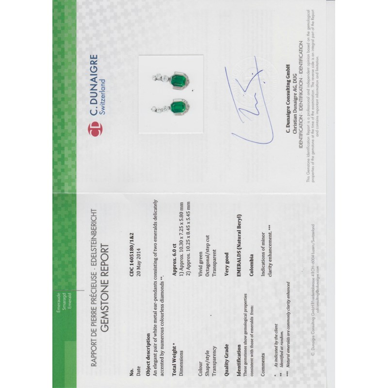 Accompanied by report number CDC 1405180/1&2 dated 20th May 2014 from C. Dunaigre, Switzerland stating that the emeralds measure 10.30 x 7.25 x 5.80mm and 10.25 x 8.45 x 5.45mm and weigh approximately 6.0cts in total and are natural emeralds with indications of minor clarity enhancement. Origin opinion: Colombian.