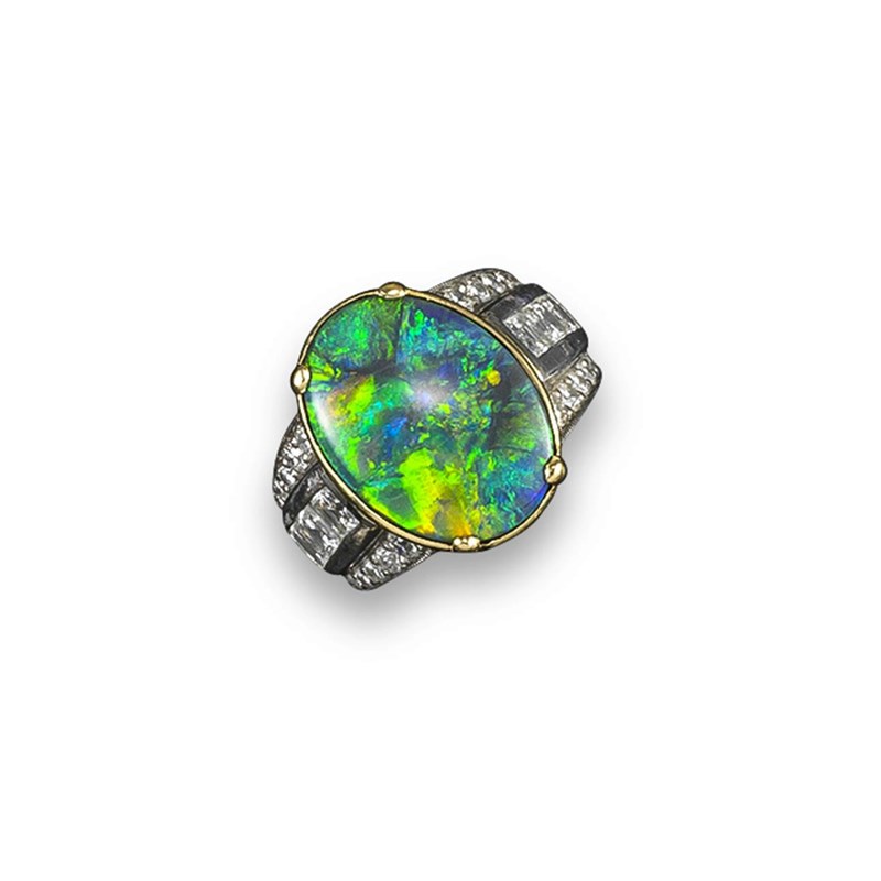 An opal and diamond set platinum ring, the oval shaped solid black opal is set with three rows of circular and baguette shaped shoulder diamonds. Size N ½.