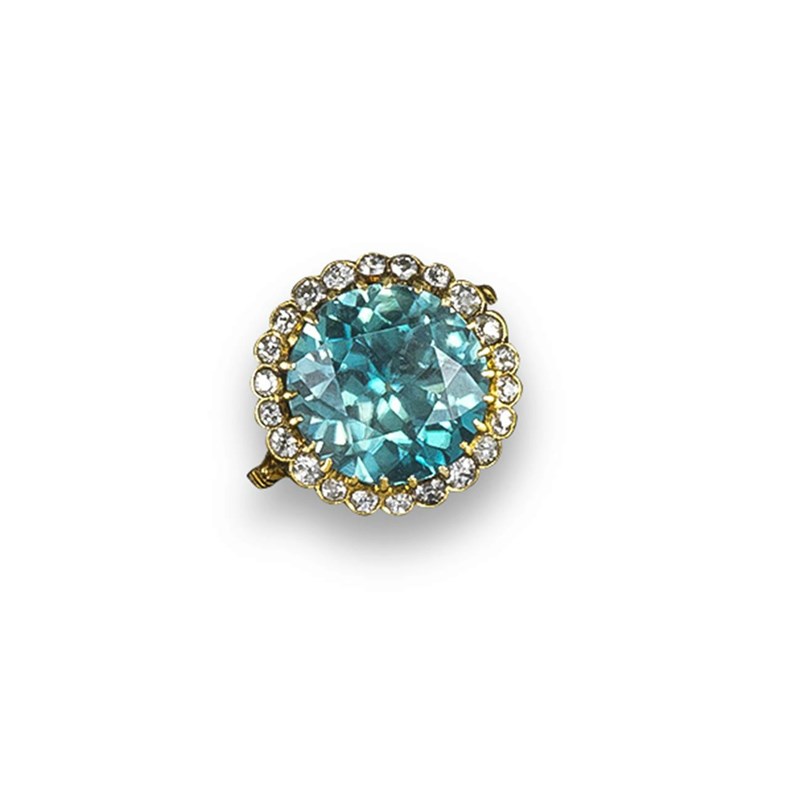 A blue zircon and diamond cluster ring, the circular cut zircon is set within a surround of old circular cut diamonds in yellow gold. Size M.
