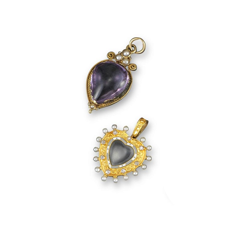 A late Victorian heart shaped gold pendant, the central glazed locket section within a blue and white enamel border, rose cut diamond and gold rope-twist pattern outer section applied with seed pearls. Inscription to reverse dated 1900. Case by Watherston & Son. With a 19th century amethyst and seed pearl filigree gold pendant.