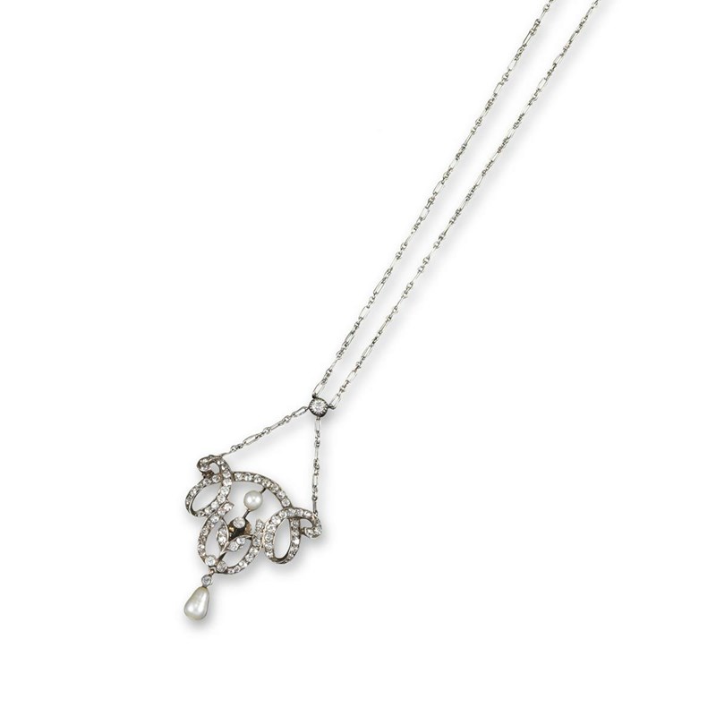 An Art Nouveau diamond and pearl pendant, set overall with graduated circular cut diamonds and two untested pearls in silver and gold. On a fine link platinum neck chain. With detachable gold brooch fitting.