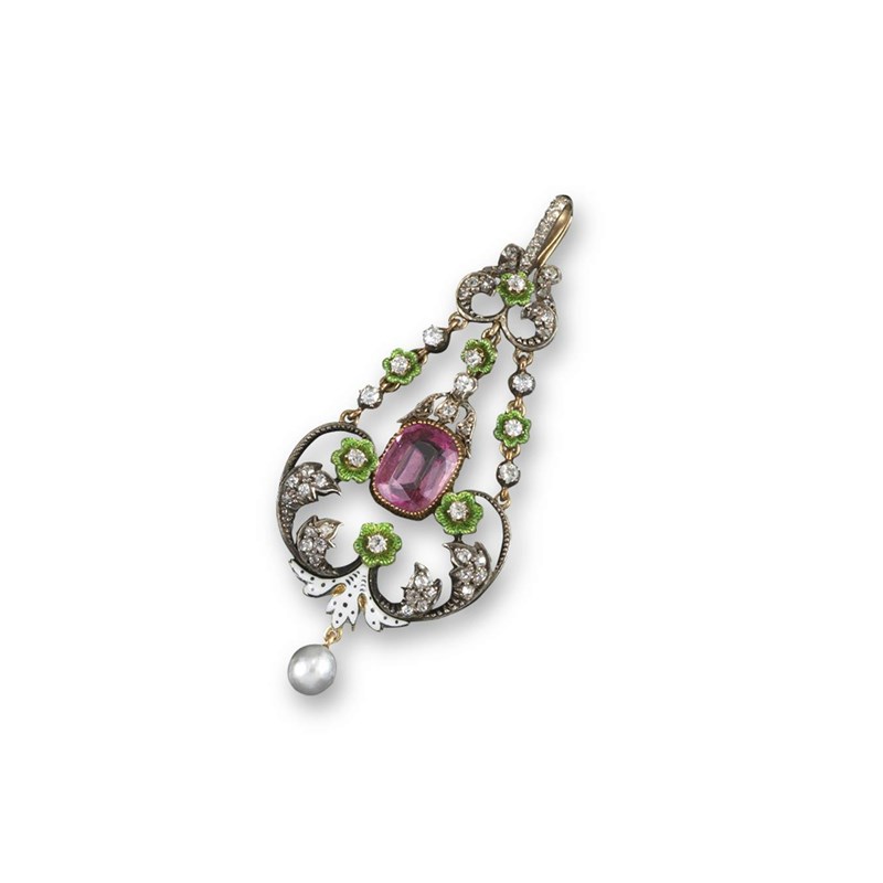 An Edwardian pink topaz, diamond and pearl pendant, of scroll design and set overall with small diamonds. Some in green enamel flower head mounts, with black and white enamel decoration and suspending a cushion shaped topaz and a pearl. Set in silver and gold. With a fine link silver chain and fitted case by Spink.