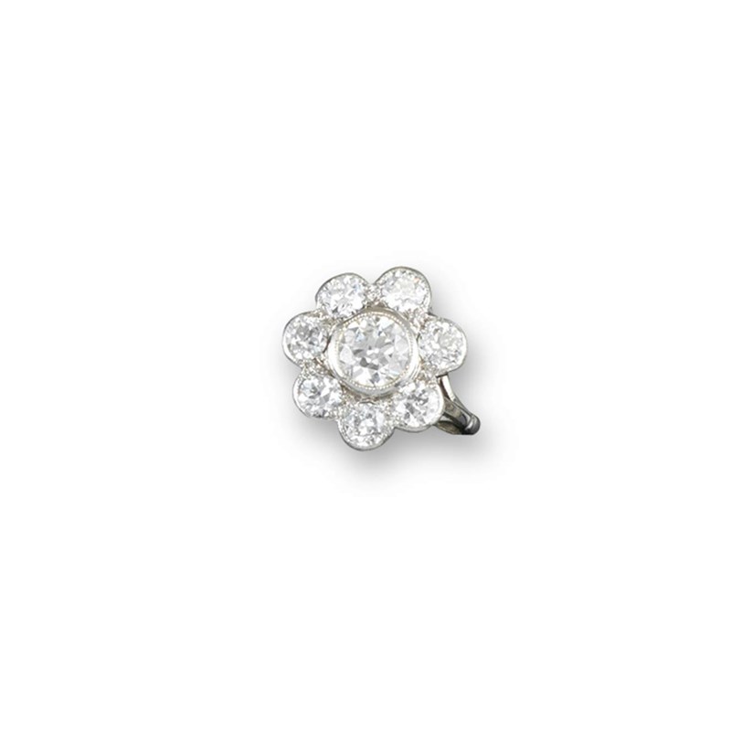 A diamond cluster ring, the centre old circular cut diamond weighs approximately 0.90cts and is set within a surround of seven further diamonds which weigh approximately 1.75cts in total. Set in platinum and white gold. Size M 1/2.