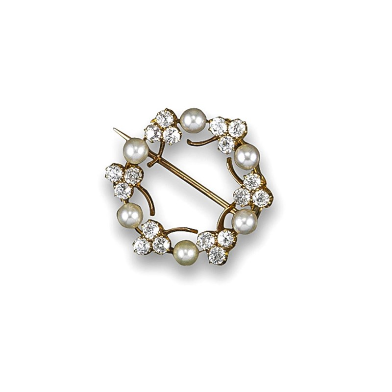 An early 20th century pearl and diamond wreath brooch, set with diamond trefoils between pearls in yellow gold. 2.2cm wide.