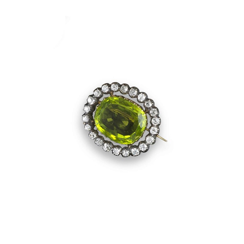 A late 19th century peridot and diamond brooch, the oval shaped peridot is set in silver and gold within a surround of small cushion shaped diamonds.