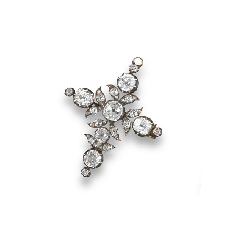 A 19th century diamond set cruciform brooch pendant, set with five larger cushion shaped diamonds and with smaller diamonds set in silver on gold.