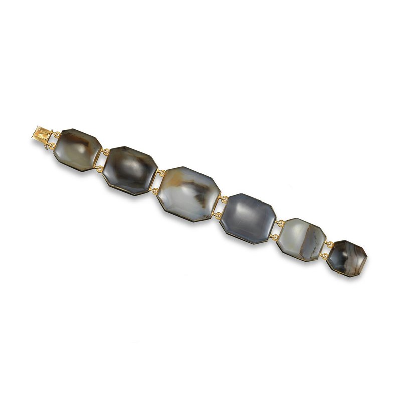 A George III agate bracelet, the six graduated octagonal cut agates set in gold. 18.5cm.