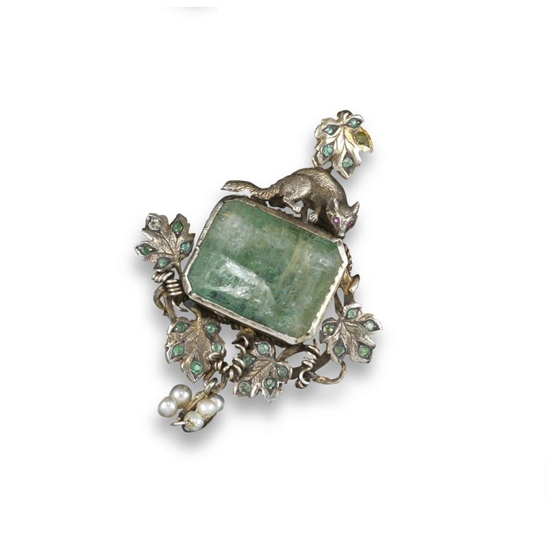 A 19th century silver pendant depicting one of Aesop's Fables, mounted with a large octagonal cut green Beryl with silver fox and emerald set vine leaves and suspending 'pearl' grapes. 6cm high.