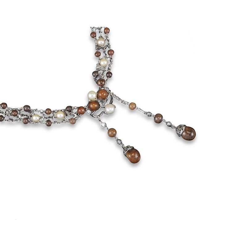 A three row pearl necklace, set with graduated clam pearls, natural pearls and diamonds and suspending two further clam pearl drops in white gold.