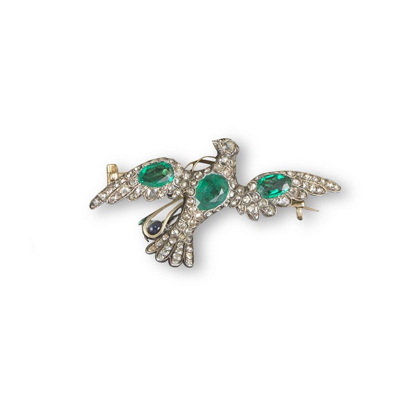 An early 19th century gold dove brooch, pave set with rose cut diamonds and three pear shaped emeralds, mounted en tremblant.
