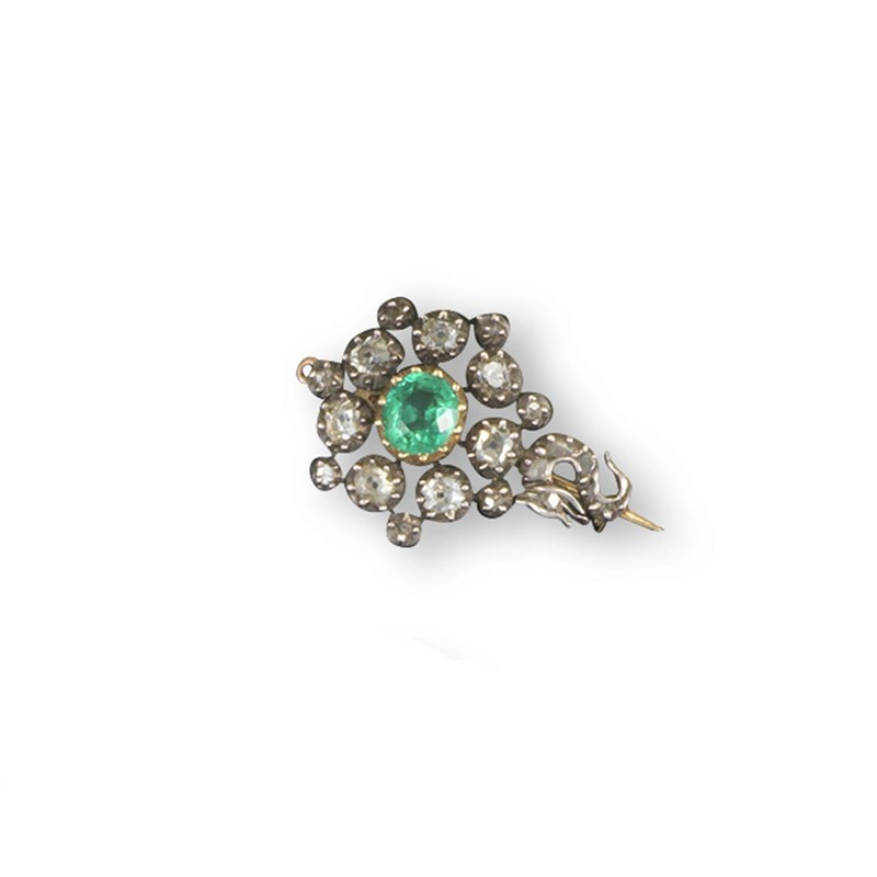 A George III emerald and diamond brooch, the oval shaped emerald is set within a cushion shaped and rose cut diamond surround in silver and gold. 2.5cm wide.