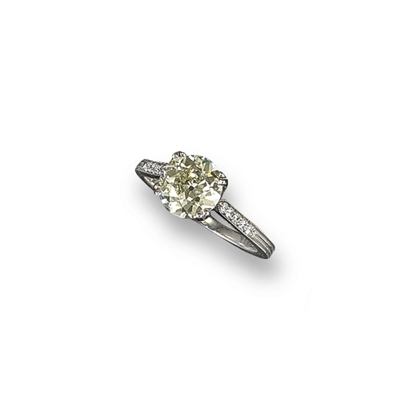 A diamond solitaire ring, the old circular cut diamond weighs approximately 2.00cts, millegrain set with diamond shoulders in platinum. Size M 1/2.