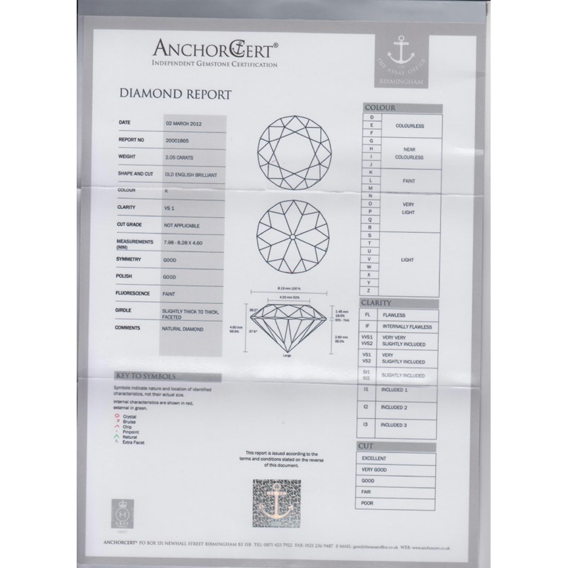 Accompanied by report number 20001865 dated 2nd March from Anchorcert, Birmingham stating that the Old English Brilliant Cut diamond measures 7.98 - 8.28 x 4.60mm, weighs 2.05ct, with K colour VS1 clarity.