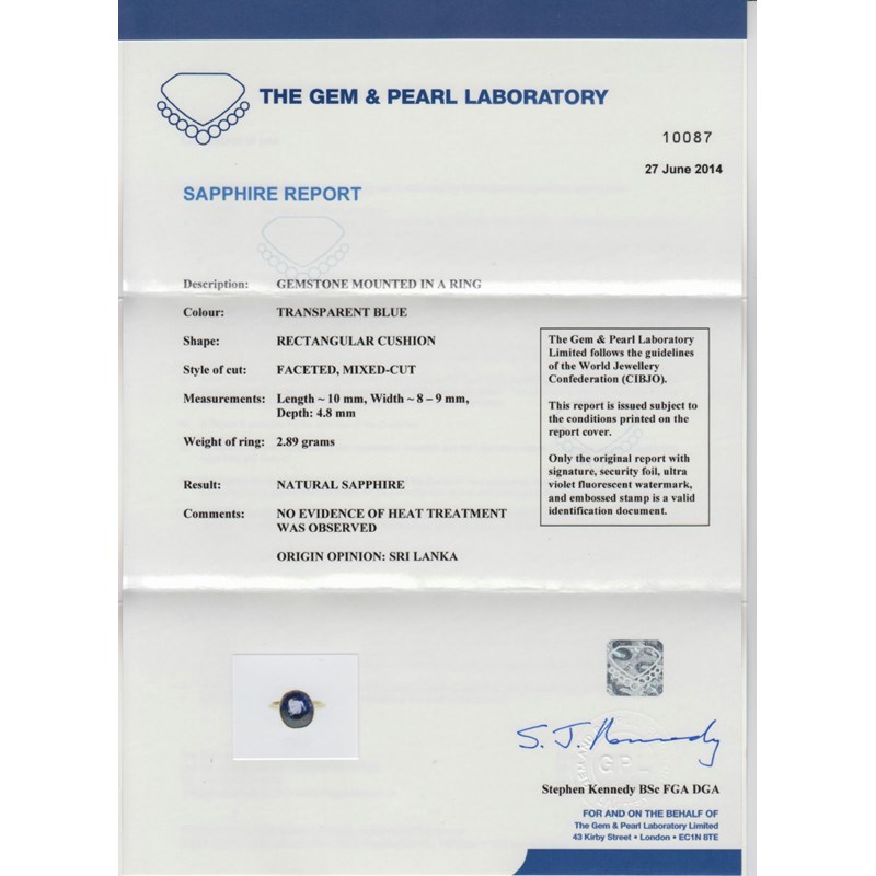 Accompanied by report number 10087 dated 27th June 2014 from The Gem and Pearl Laboratory London stating that sapphire measures 10 x 8 - 9 x 4.8mm and is a natural sapphire with no evidence of heat treatment. Origin opinion: Sri Lanka.
