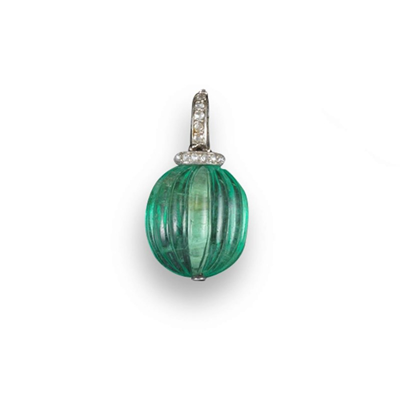 A carved emerald pendant by Cartier, the fluted emerald bead suspended from a diamond set collar and hinged bale. Signed Cartier with inventory number 2818259. 2.3cm long.